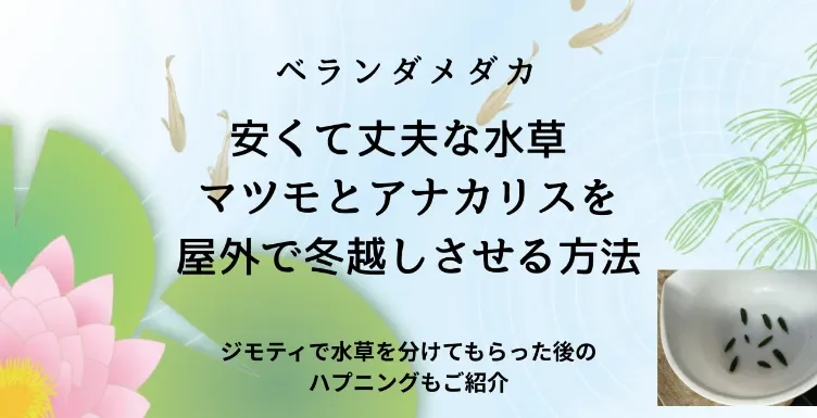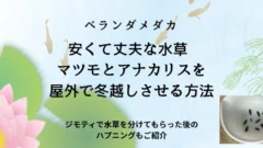 水草安くて丈夫なメダカの水草 マツモとアナカリスを 屋外で冬越しさせる方法 アナカリスとマツモは安くて丈夫で誰でも簡単に育てられるメダカ初心者におすすめの水草。普段の手入れと屋外で冬越しさせるポイントについて。またジモティで水草を分けてもらった時のハプニングもご紹介します。 2026.03.10水草