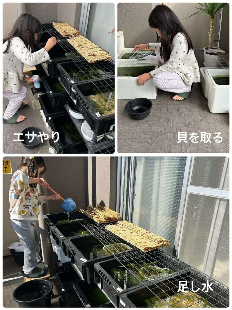 貝も水換えのたびに捨てても捨てても殖えてくる。季節関係なくすごい繁殖力です。でもエビに比べたら捨てるのに罪悪感が無いからマシですね。容器にくっついているので、つまんでポイっと捨てられます。貝は孫の手を借りて取りますよ。