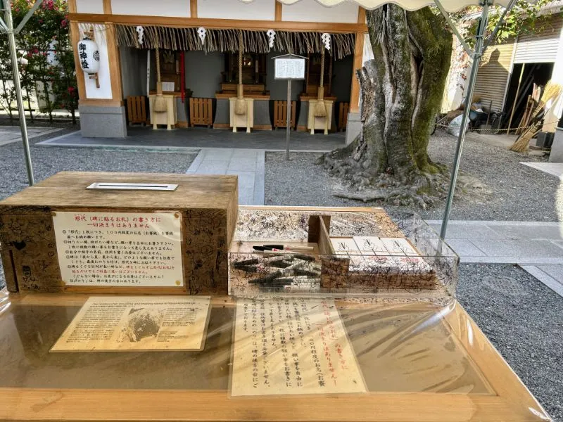 続いて「形代」と呼ばれる紙に、「切りたい縁・結びたい縁」などの願い事を書きます。書き方に決まりは無く、いくつ願い事を書いてもいいし、表裏にも書いていいそうです。気持ちとして「形代」1枚100円を木の箱に入れます。