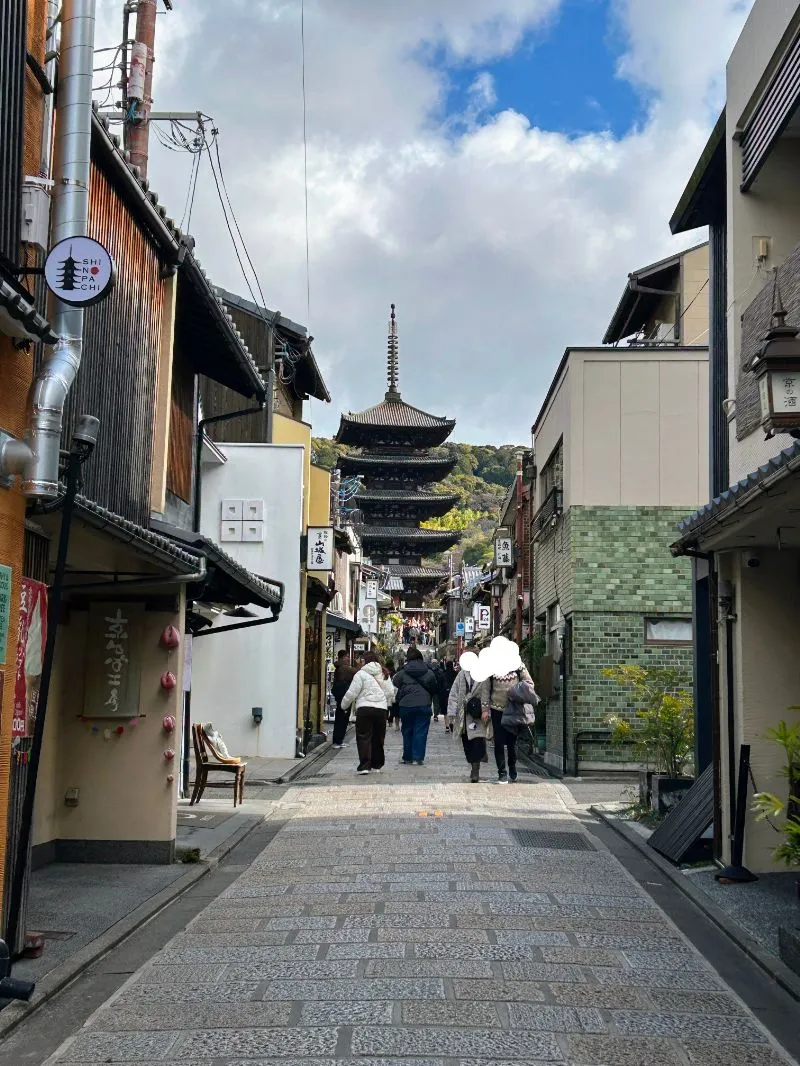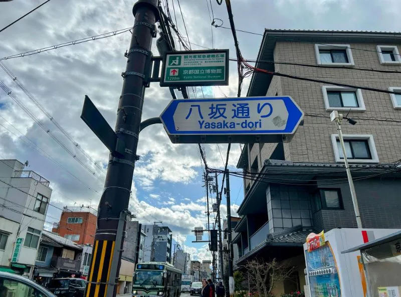 安井金毘羅宮から少し南に進むと、八坂通りがあります。この細い道を入ると、奥に有名な「八坂の塔」が見えますよ。バスに乗ったら必ずここで八坂の塔をチラッと見ますよね。
