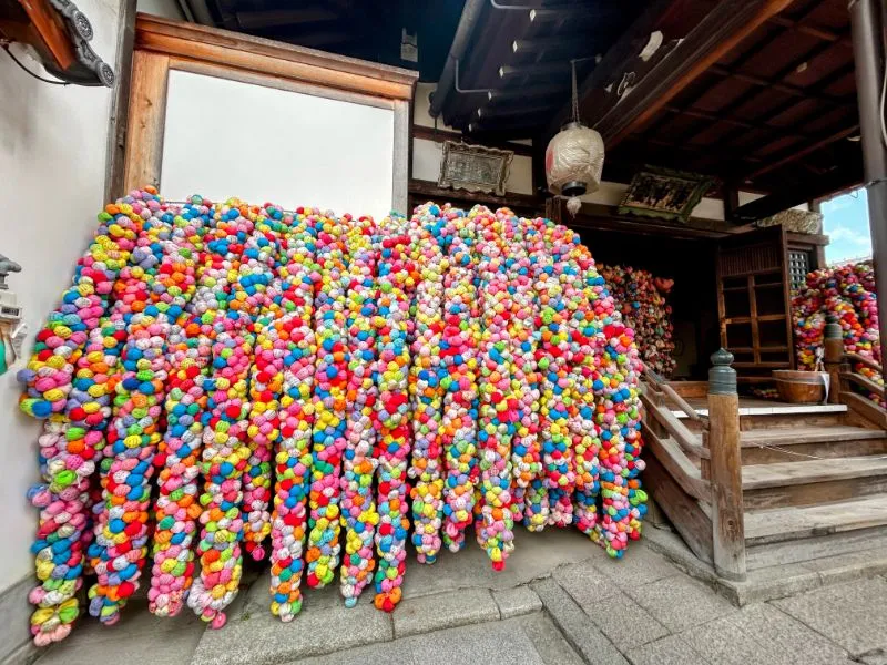 カラフルな丸いものは「くくり猿」。猿は庚申さん(本尊 青面金剛)の お使いですが、くくり猿は、手足をくくられ動けない姿を表しています。人の心が欲につられて動かないように、庚申さん(本尊)の霊力によってくくりつけようとしているそうです。