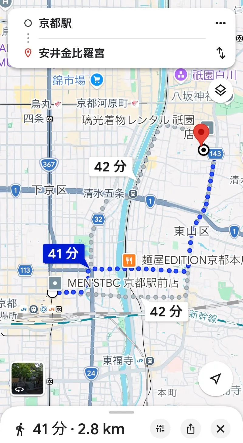 でも、もし天気が良くて、荷物も少なくて、元気な人なら歩いても行けるんですよ。私は運動と節約のため京都駅から歩きました。七条通りを東に、鴨川を渡り、博物館や三十三間堂を通り過ぎ、突き当りの東大路通を左に曲がって(北方向)歩いたら約40分かかりました。