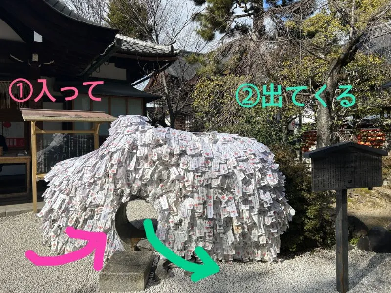 たくさんの「形代」をまとった「縁切り縁結び碑」は迫力がありますね。ここでは、「形代」を持って願い事を念じながら碑の表から裏へ穴をくぐります。これでまず悪縁を切り、次に裏から表へくぐって良縁を結びます。