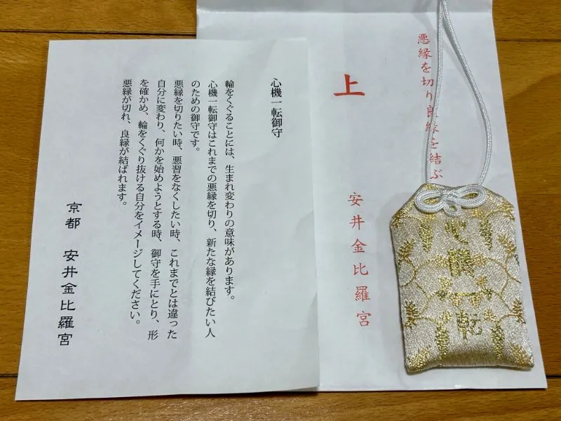 輪をくぐることには、生まれ変わりの意味があります。心機一転御守はこれまでの悪縁を切り、新たな縁を結びたい人のための御守です。悪縁を切りたい時、悪習をなくしたい時、これまでとは違った自分に変わり、何かを始めようとする時、御守を手に取り、形を確かめ、輪をくぐり抜ける自分をイメージしてください。悪縁が切れ、良縁が結ばれます。